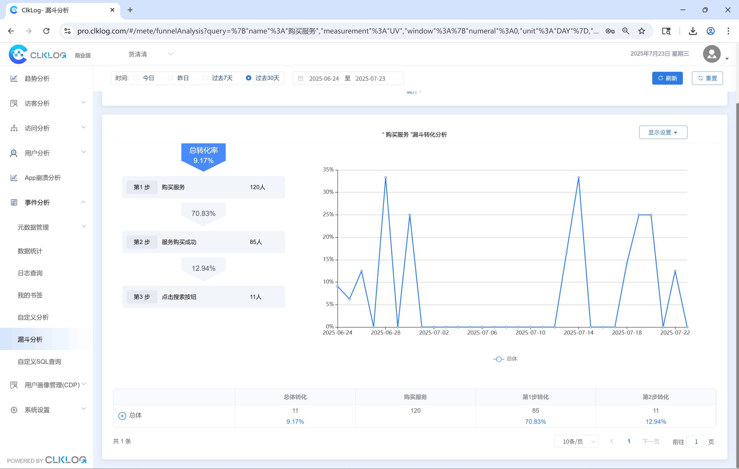 提供自定义事件分析、转化漏斗等进阶功能
