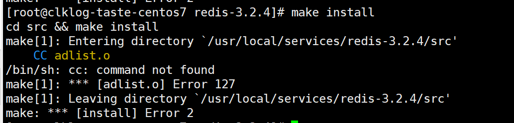 如下图所示,make install 安装redis可能会出现系统无gcc环境的情况