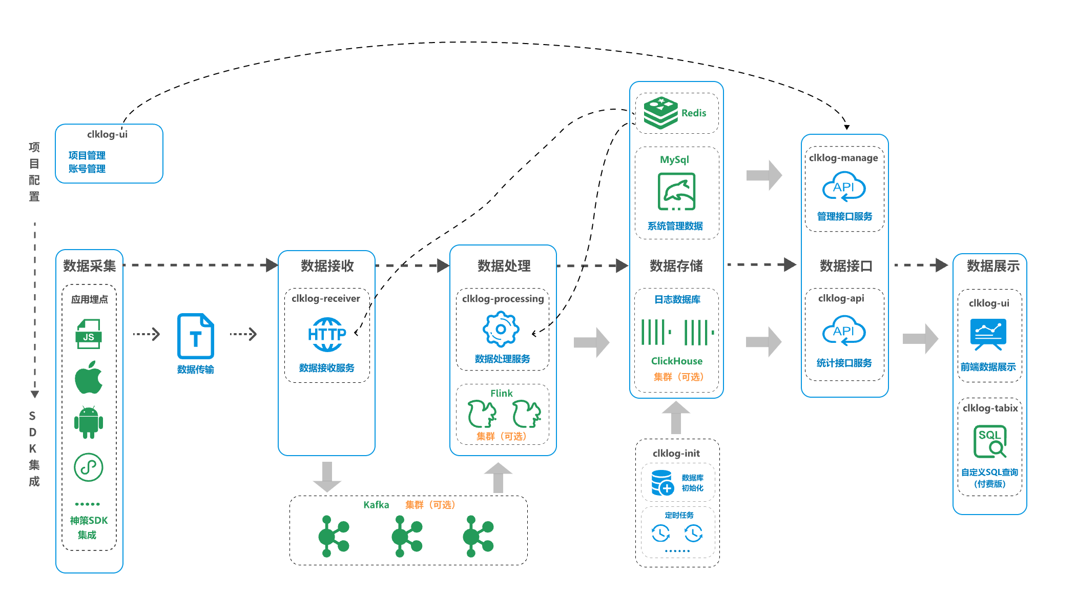 处理服务【clklog-processing】:数据处理服务,依托flink,消费kafka数据并存入clickhouse。