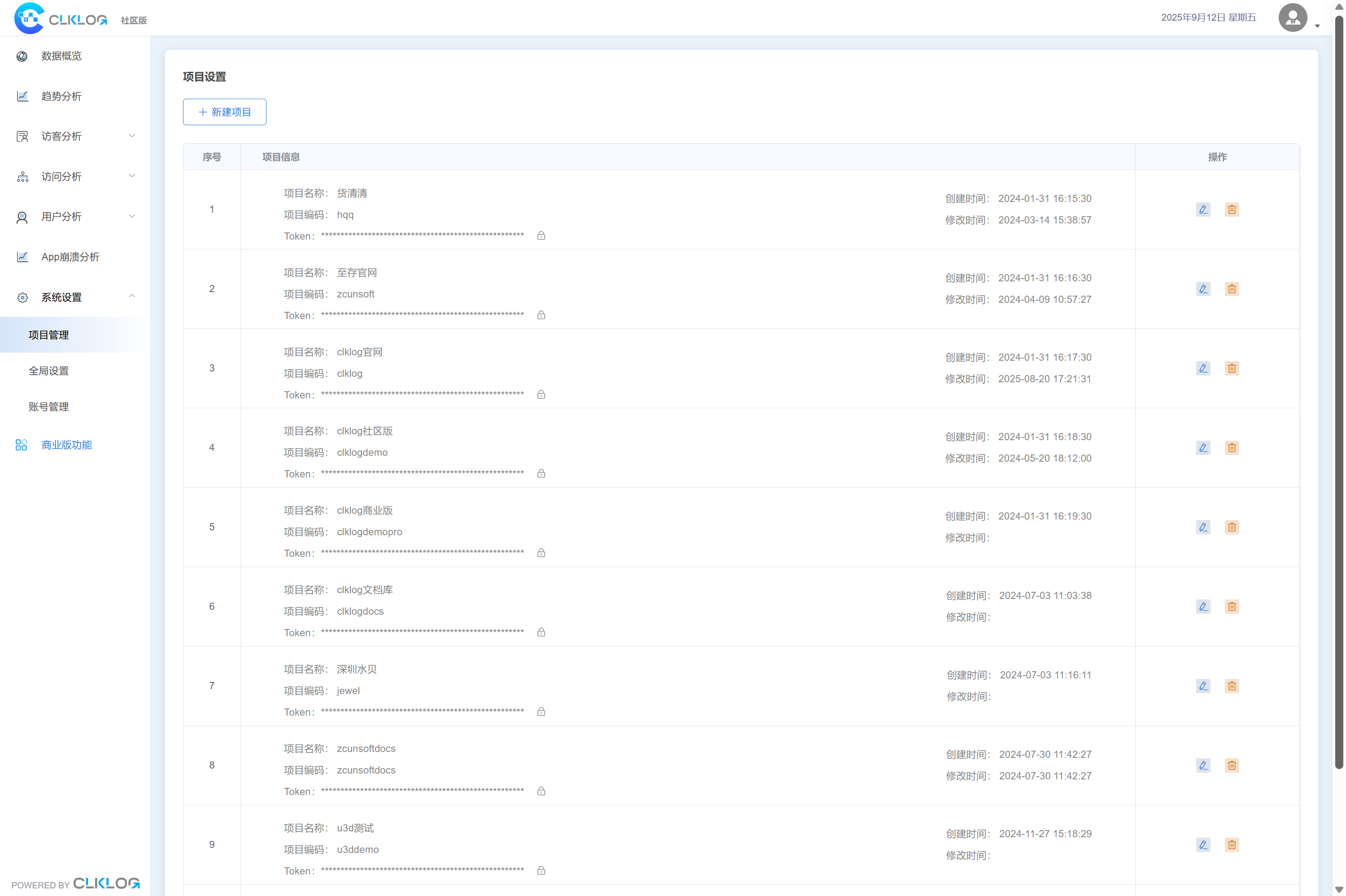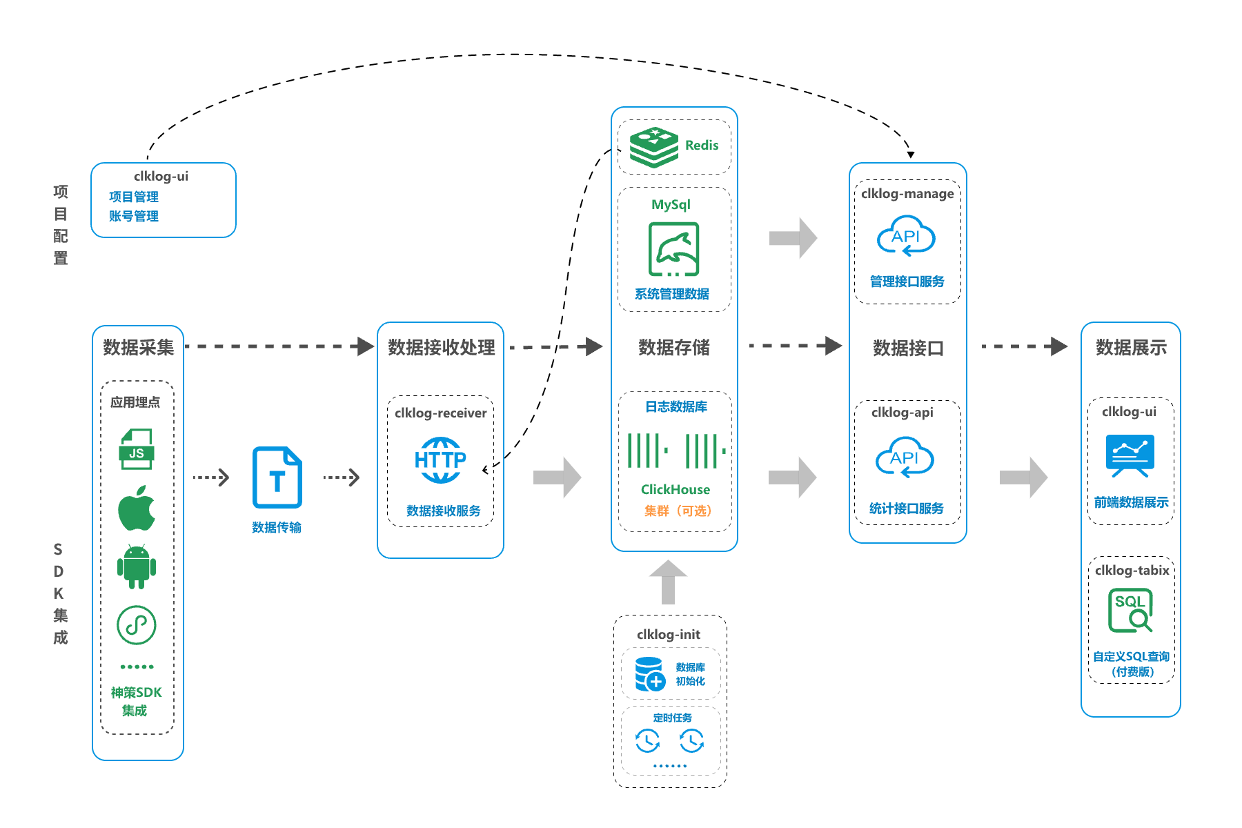 管理接口【clklog-manage】:管理接口,提供clklog-ui前端项目管理、账号管理及数据清洗过滤配置相关接口。