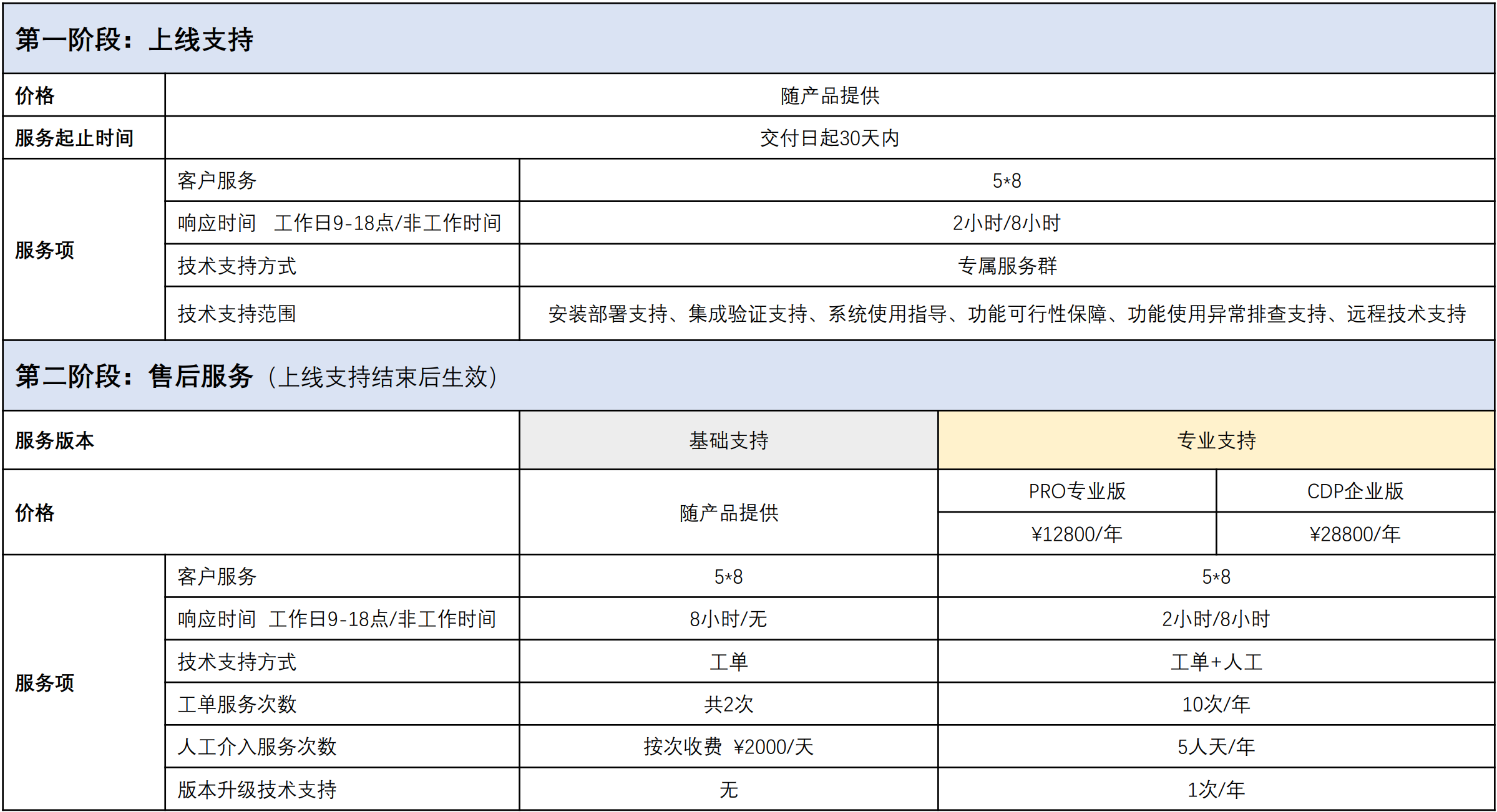 上线支持:自您购买ClkLog产品并完成交付之日起,将自动开启上线支持服务,有效期为30天。上线支持阶段旨在协助您完成系统部署与功能验证,确保产品可顺利运行。上线支持期满后,服务将自动转入售后阶段。
